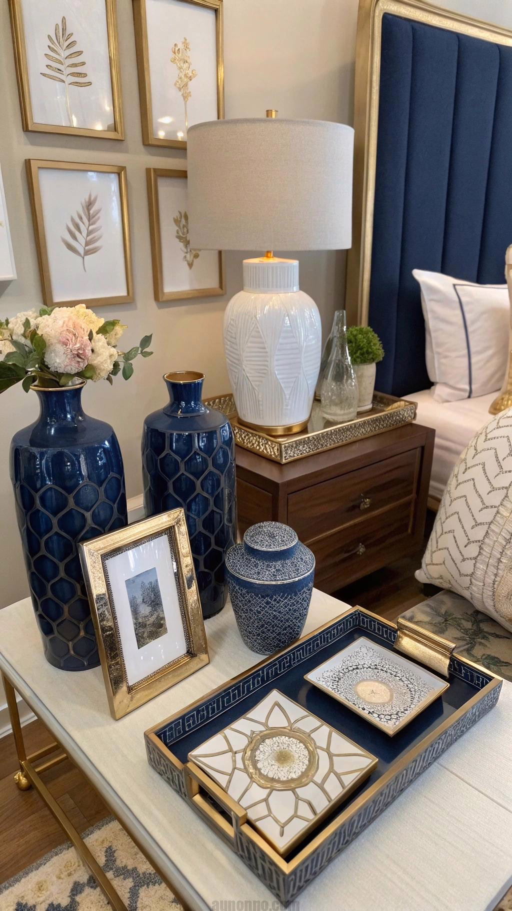 When selecting decorative accents, think about the materials and textures. Mixing different materials, such as ceramic, glass, or metal, can create visual interest and depth. You can also incorporate other colors that complement navy blue, such as gold, white, or blush, to create a balanced and harmonious look.