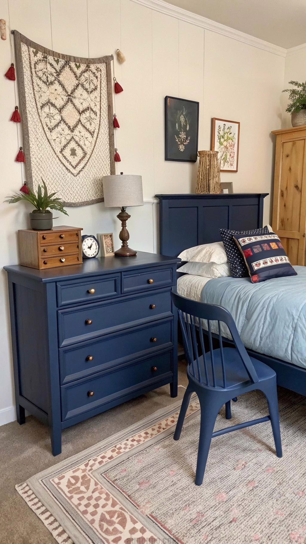 Incorporating navy blue furniture can make a bold statement in your bedroom. Consider a navy blue dresser, nightstand, or even a bed frame to add a pop of color. This can create a striking contrast against lighter walls and decor.