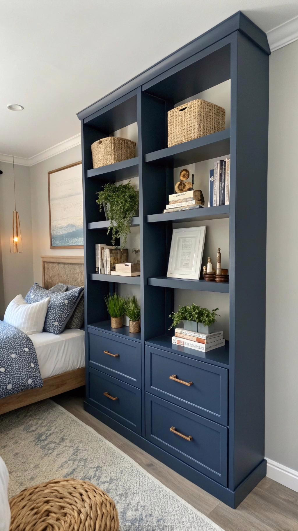 To enhance the overall design, coordinate your navy blue shelving with other navy blue elements in the room. This will create a cohesive look and make your bedroom feel well-designed and inviting.