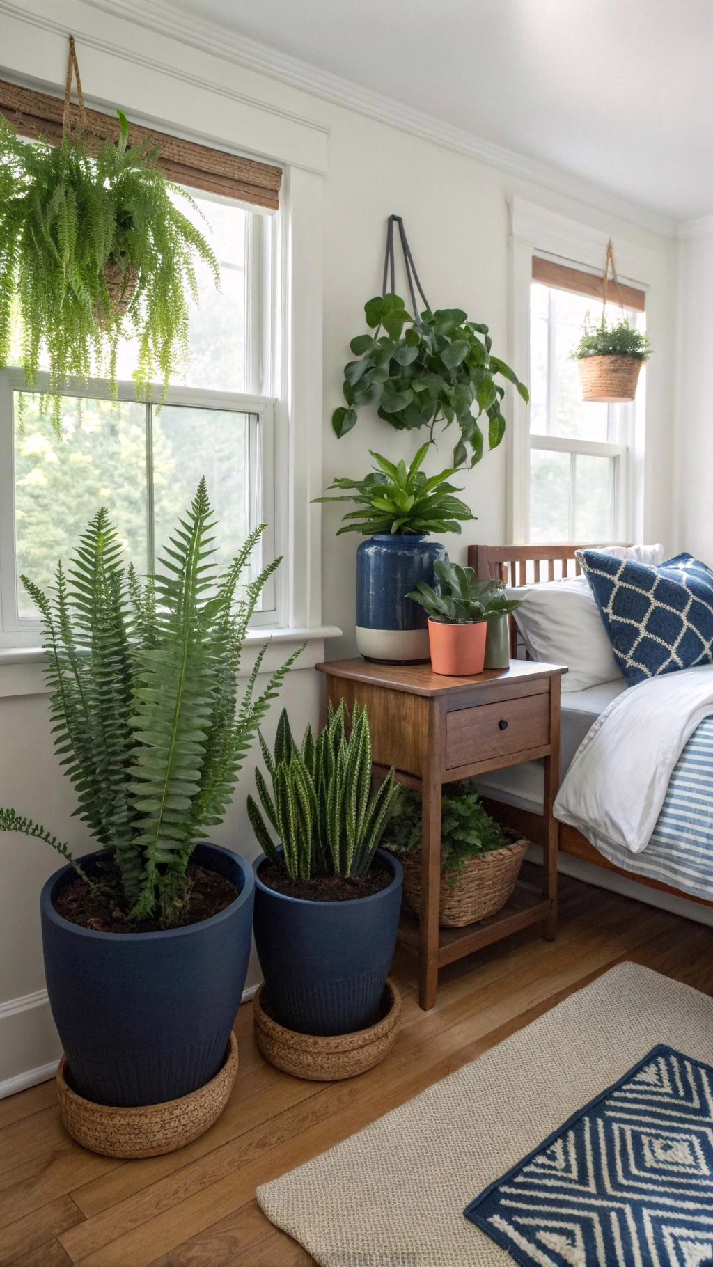 Incorporating plants and greenery in navy blue pots can add a refreshing touch to your bedroom decor. Choose a variety of plants, such as succulents, ferns, or snake plants, and place them in navy blue ceramic or terracotta pots. This can create a vibrant contrast against the navy blue elements in your room.