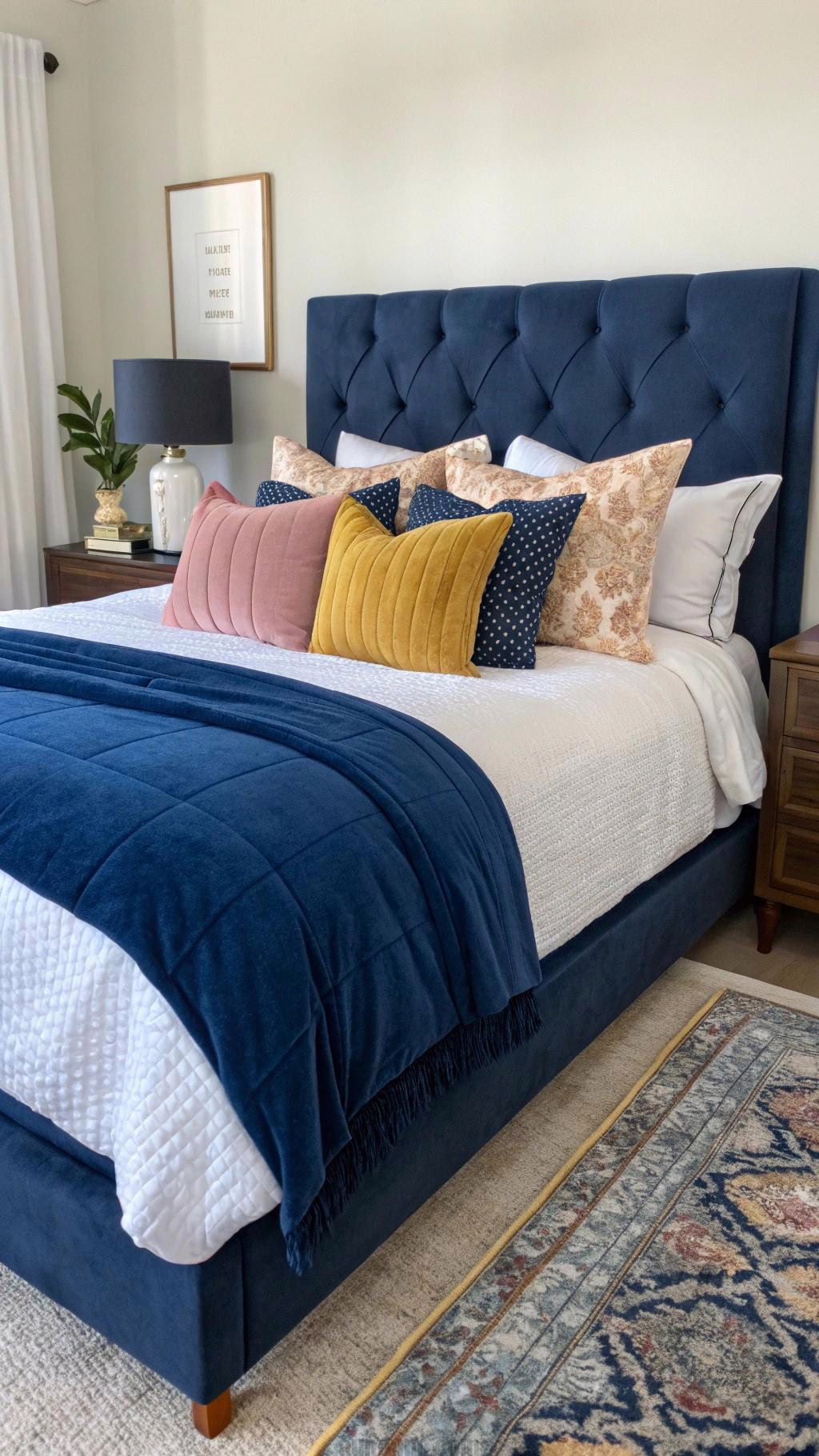 Don’t forget about the bed frame and headboard. A navy blue upholstered headboard can serve as a stunning centerpiece for your bedroom, making the space feel more luxurious and well-designed.