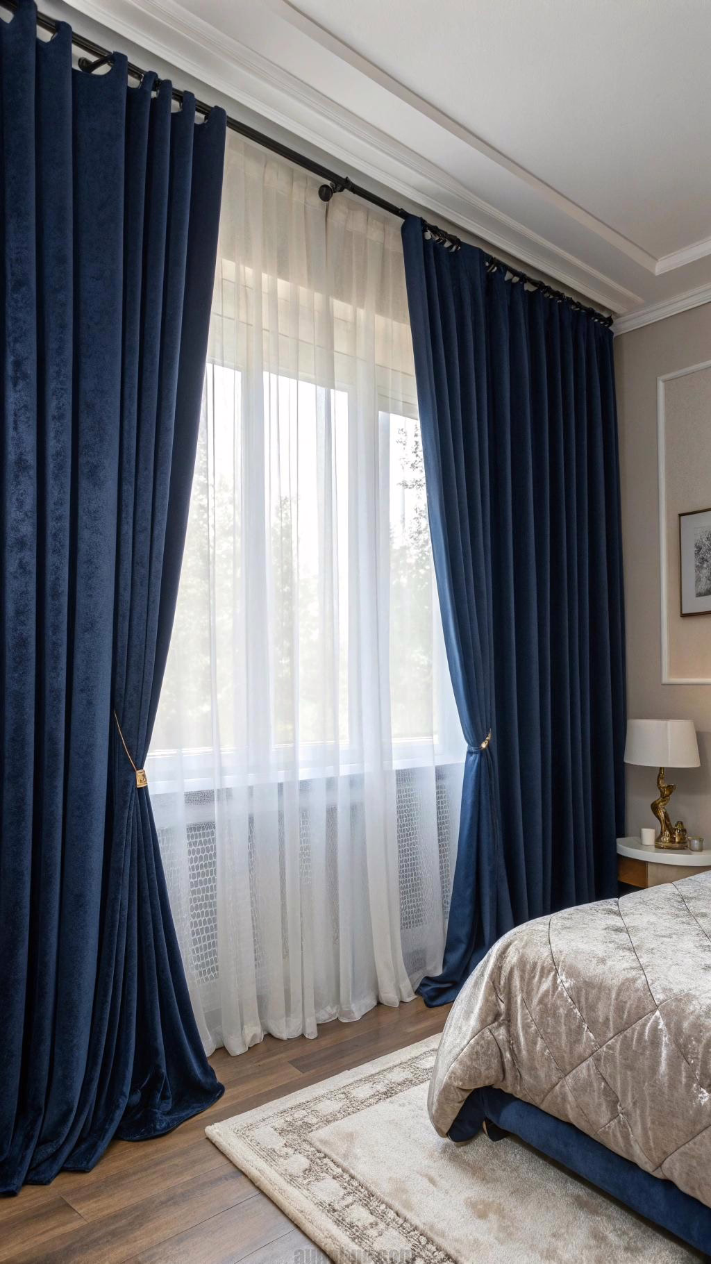 Navy blue curtains can add a touch of drama and elegance to your bedroom. Choose floor-to-ceiling curtains to create an illusion of height and make the room feel more spacious. Light-filtering fabrics can allow natural light to enter while still providing privacy.