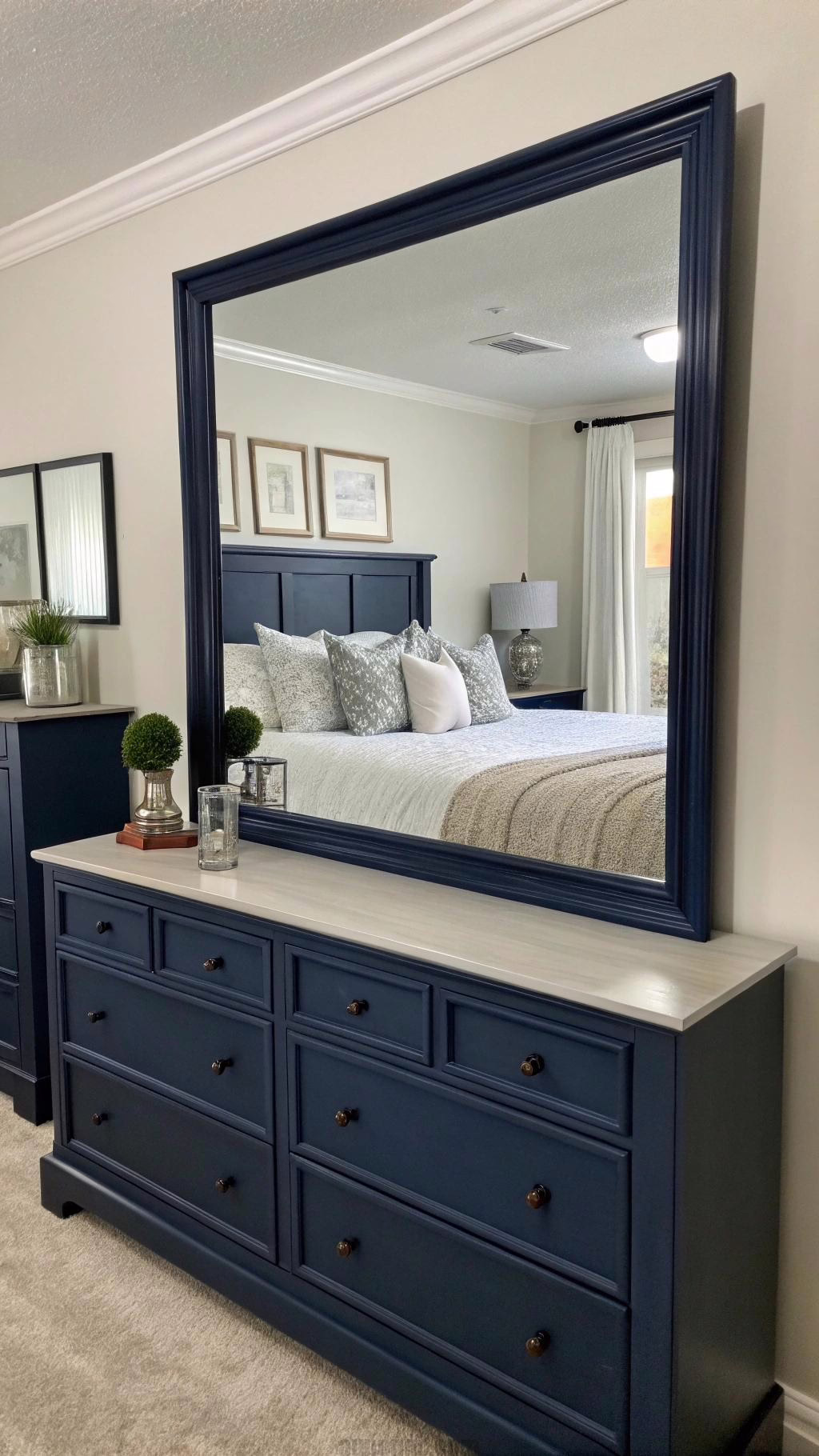 Navy blue mirrors can serve as both functional and decorative elements in your bedroom. Consider a large navy blue-framed mirror as a statement piece above a dresser or vanity. This can create a focal point and enhance the overall design of the space.