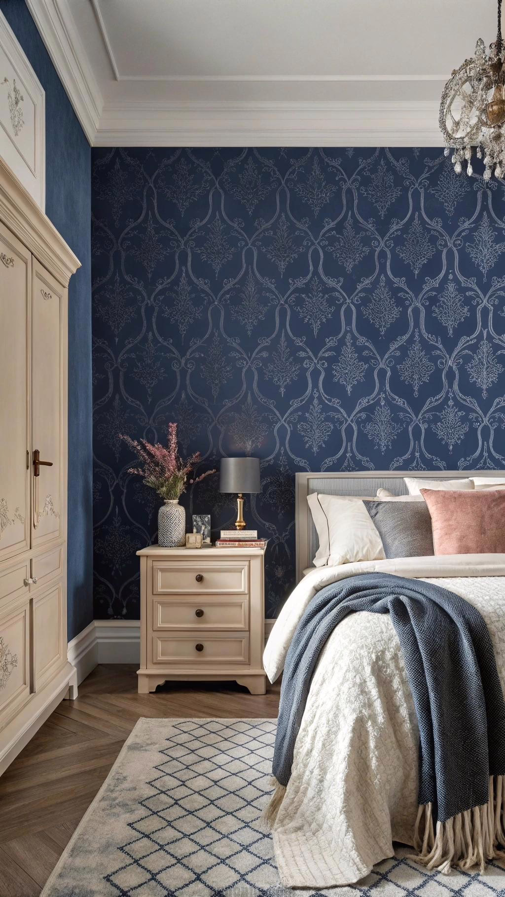 Navy blue wallpaper can add a dramatic flair to your bedroom. Whether you choose a solid navy blue design or one with patterns, wallpaper can create a stunning backdrop for your decor. Consider using it on one accent wall or throughout the entire room for a bold statement.