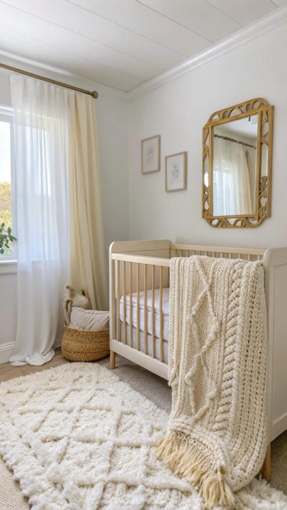 Neutral layered rugs add texture and warmth to a nursery. Use rugs in soft tones like beige, gray, or cream. This creates a cozy and inviting space for your baby.