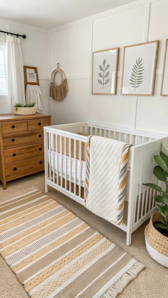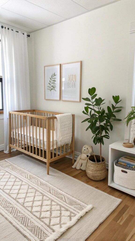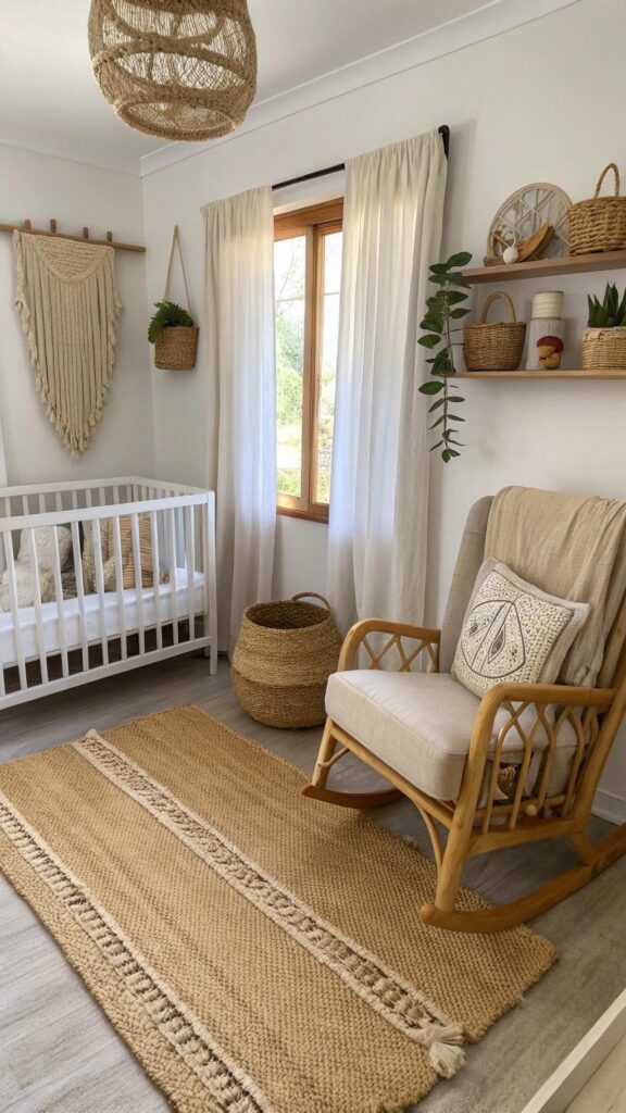 Earthy textures like jute, rattan, and linen bring a natural feel to a neutral nursery. These materials add warmth and depth to the space while maintaining a calming vibe. Use a jute rug or rattan baskets for storage.