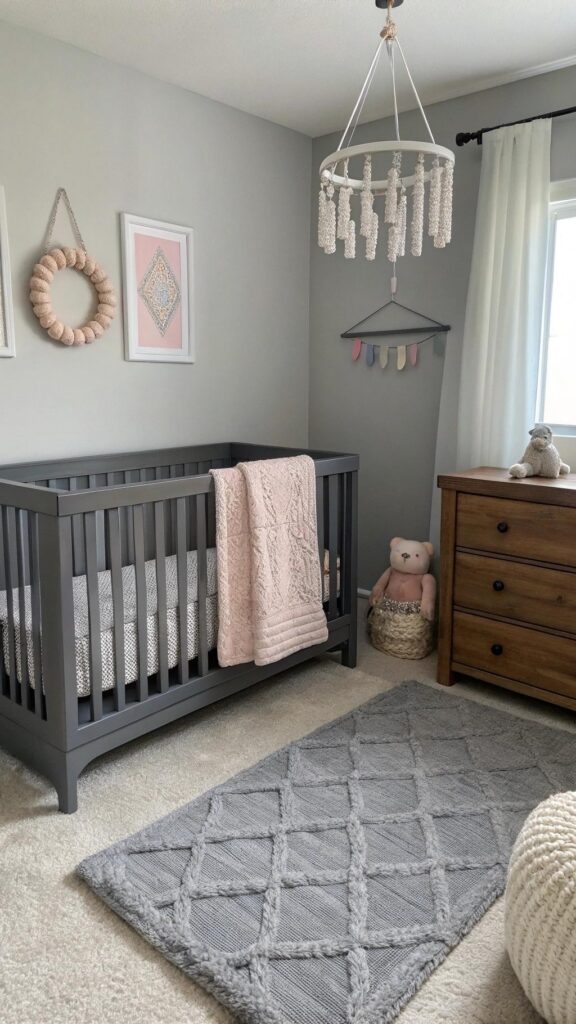 Pair greige walls with white or light wood furniture for a balanced look. Add a plush gray rug and soft throw blankets for extra comfort. This color scheme is ideal for parents who love contemporary design.