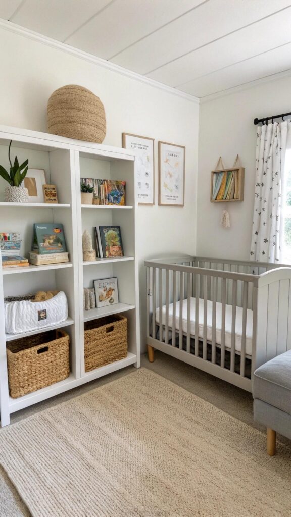 A neutral bookshelf display adds functionality and style to a nursery. Use a bookshelf in white or light wood to display books, toys, or decor items. This keeps the room organized and visually appealing.