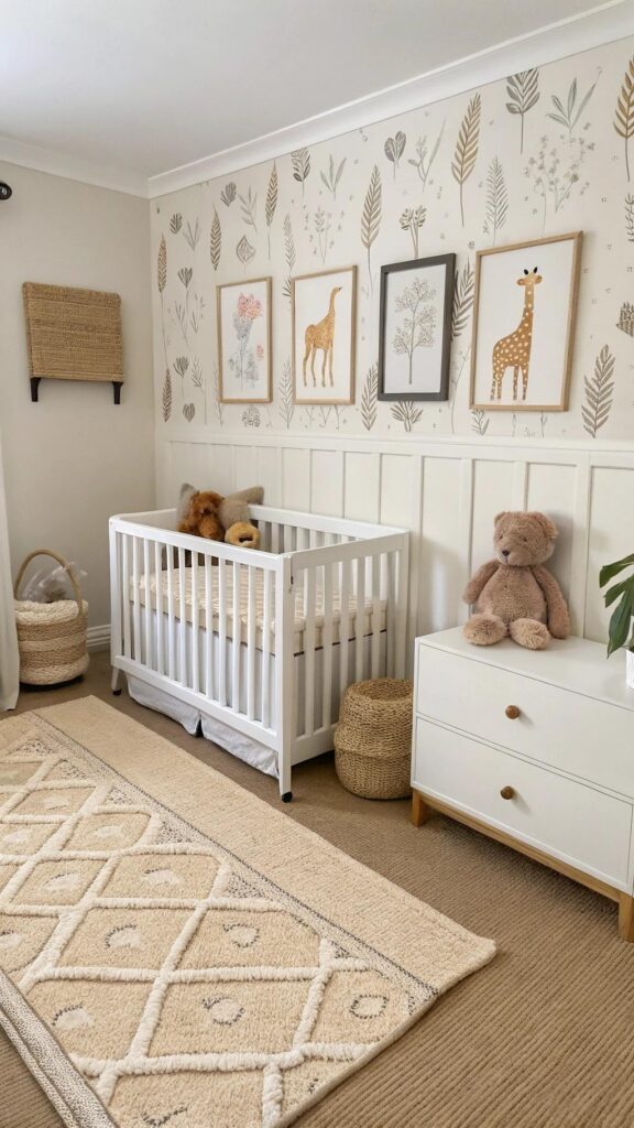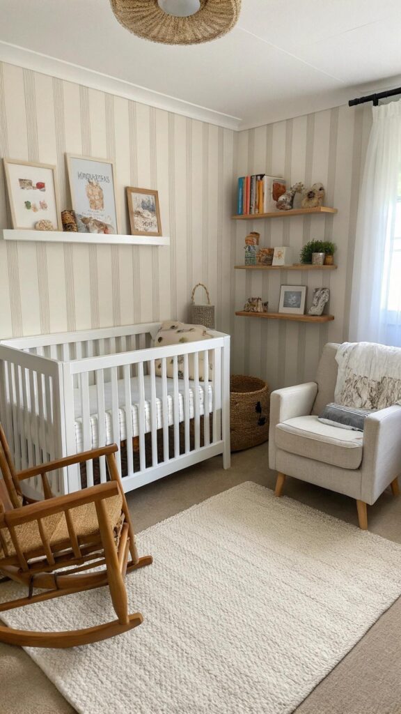 A neutral wallpaper accent wall adds visual interest to a nursery without overwhelming the space. Choose patterns like subtle stripes, geometric shapes, or nature-inspired designs. This creates a focal point while keeping the room calm.