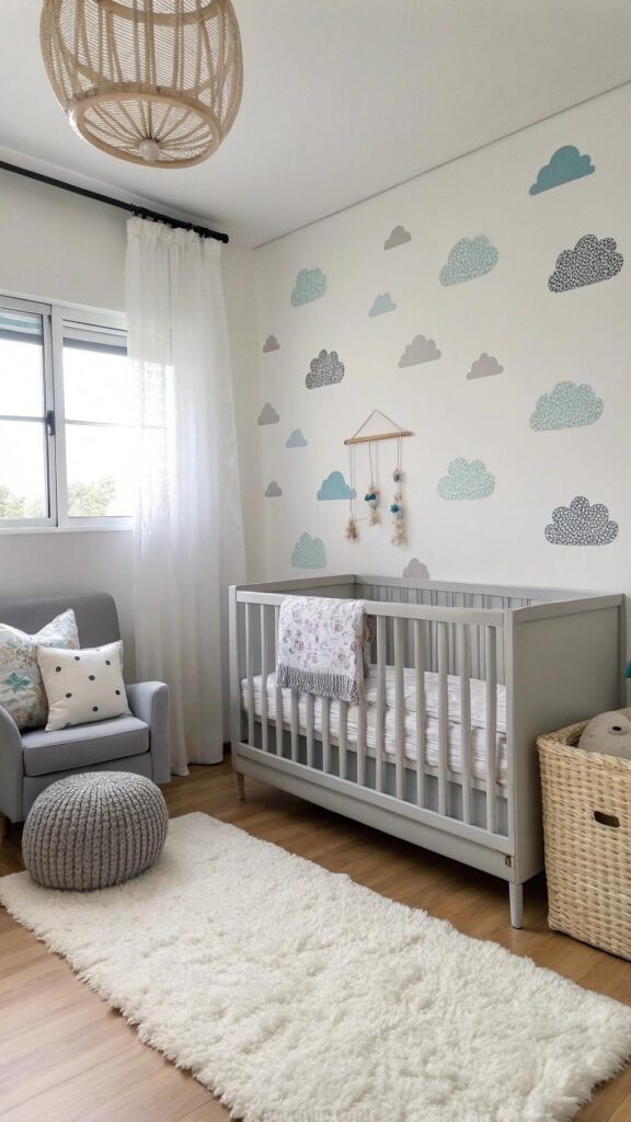 Neutral cloud-themed decor creates a dreamy and calming nursery. Use cloud-shaped wall decals, mobiles, or pillows in soft tones. This adds a whimsical touch without overwhelming the space.