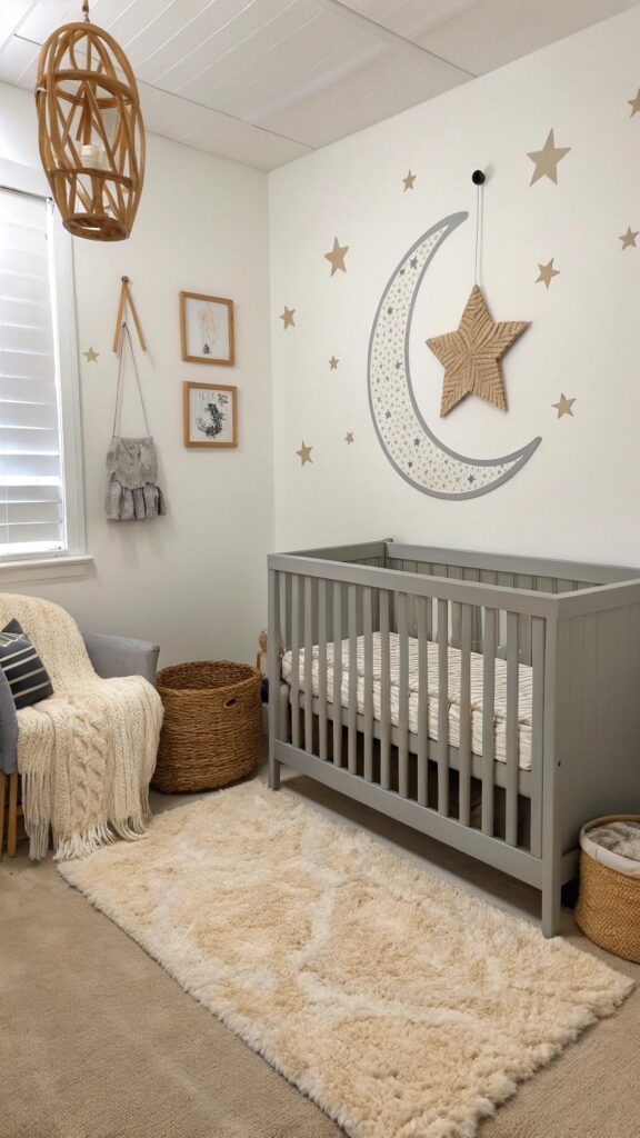 A neutral moon and stars theme creates a calming and magical nursery. Use moon-shaped wall art, star mobiles, or bedding in soft tones. This adds a whimsical touch without overwhelming the space.