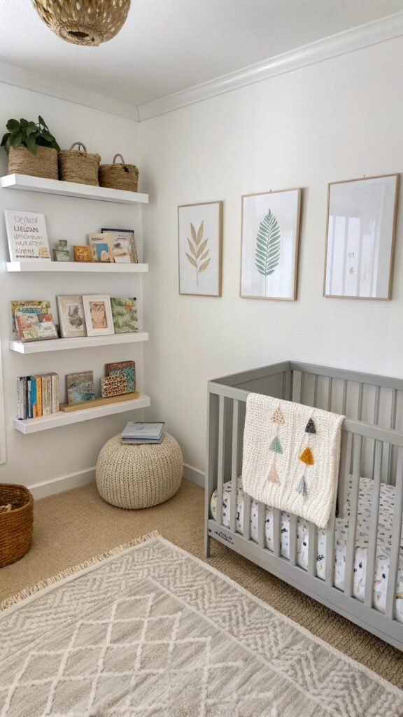 Neutral floating shelves add functionality and style to a nursery. Use shelves in white or light wood to display books, toys, or decor items. This keeps the room organized and visually appealing.