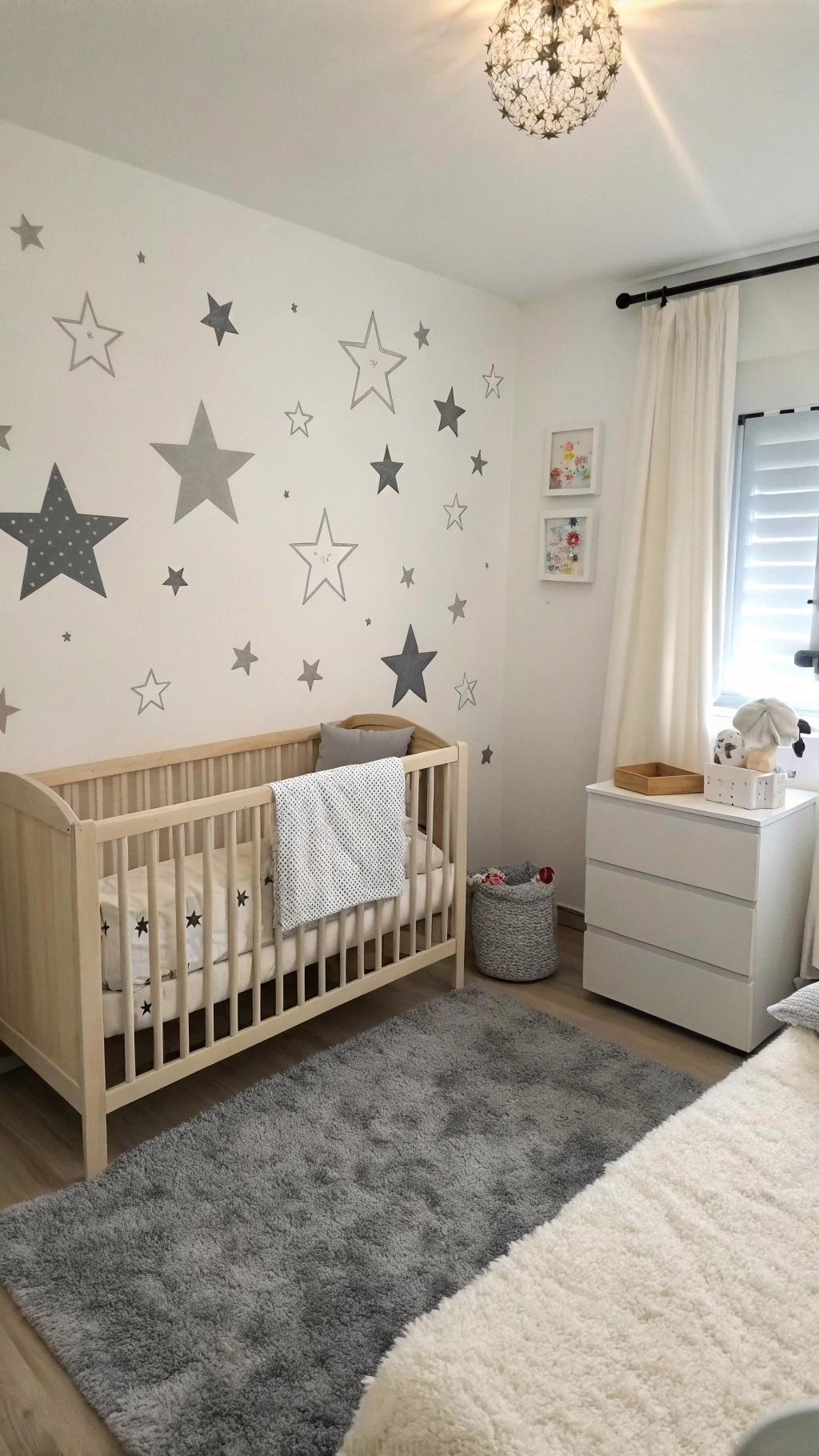 A neutral starry night theme creates a magical and calming nursery. Use star-shaped wall decals, mobiles, or bedding in soft tones. This adds a whimsical touch without overwhelming the space.