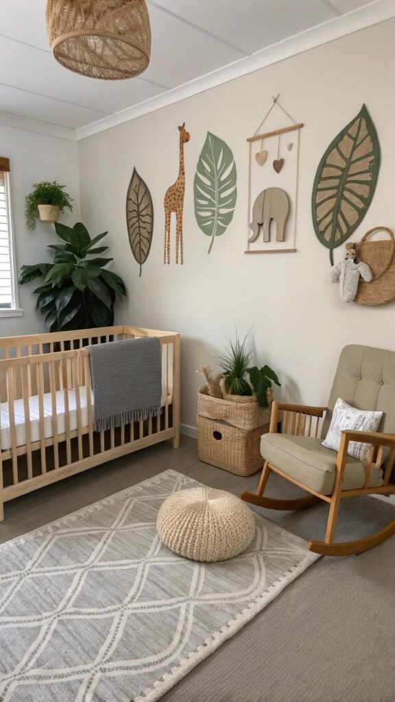 Pair nature-inspired decor with soft neutrals like beige or gray. This approach creates a serene and timeless space for your baby. It’s perfect for parents who love a natural aesthetic.