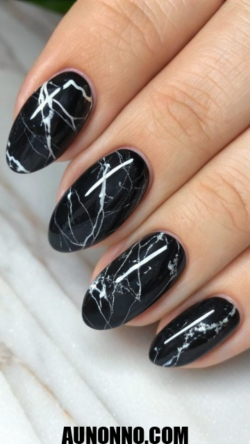 Black marble nails create a luxurious fine-art look. They mimic marble stone patterns with regal depth. It’s mysterious and high-end in style.