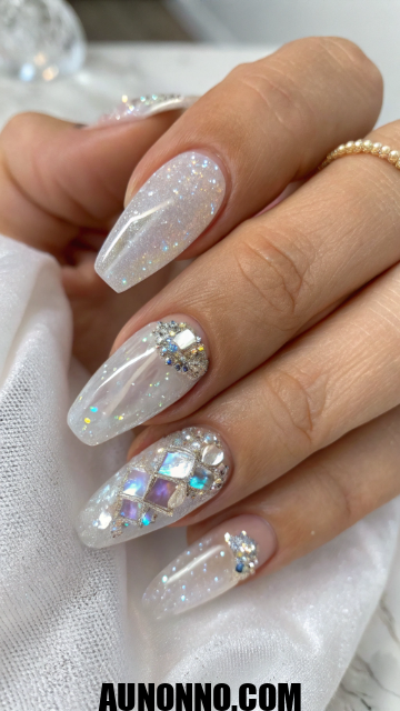 This look pairs with silver or pearl accessories easily. It feels delicate but artistic. Crystal nails embody modern minimal beauty.