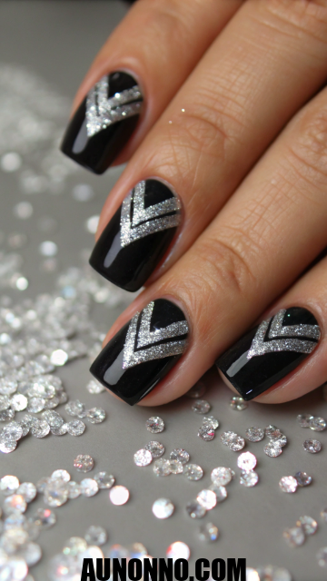 Start with a deep black polish as your base. Then apply silver glitter tips or diagonal stripes for accent. The higher contrast creates a sophisticated party effect.