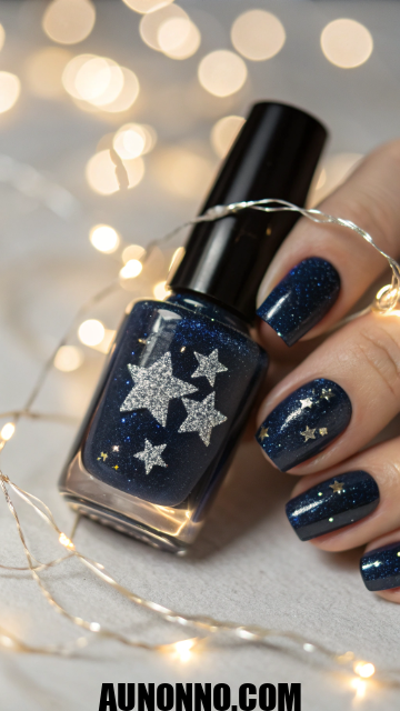 Use a black or dark gray base and add tiny silver star stickers or polish designs. A few scattered stars create a dreamy celestial look. Coat with thin glitter polish to tie everything together.