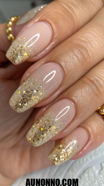 To get this look, start with a nude or beige base coat, then add gold glitter polish across each nail. You can make the tips heavier for an ombré effect or go full sparkle for drama. Seal it with a clear top coat for lasting shine.