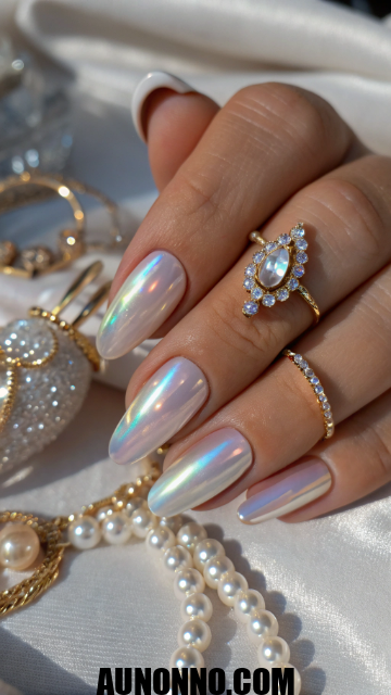 Use a light nude or milky white base coat. Rub on pearl chrome powder to get that iridescent sheen. Seal with gel top coat for silky shine.