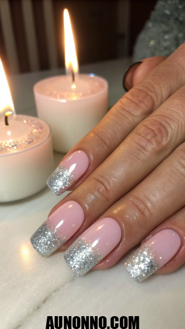 Use pale pink base polish and blend silver or gold glitter from tip downward. Keep the effect soft for a natural glow. Add clear top coat to finalize.