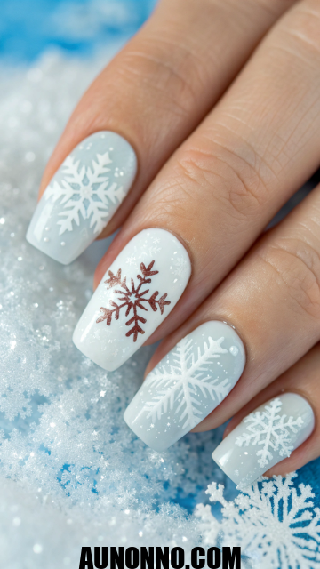 Use white polish over pale blue or nude bases. Draw delicate snowflake patterns with a thin brush or decal. Add a dust of glitter for frosty depth.