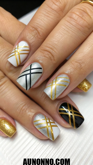 Use black, white, or nude backgrounds with gold or silver tape. Create vertical, horizontal, or diagonal patterns for dynamic effect. Finish with glossy top coat to set it all.