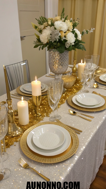 A gold and silver color scheme is timeless and elegant. Start with a shimmering gold tablecloth as your base. Layer it with silver chargers and white dinner plates for a sophisticated look. Add gold and silver cutlery to enhance the theme. For centerpieces, consider tall glass vases filled with gold and silver ornaments or fresh white flowers.
