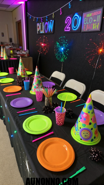 Add fun elements like neon party hats or glow-in-the-dark accessories for guests to wear. Use colorful napkins and place settings to enhance the lively atmosphere. This theme is perfect for those who want to celebrate the New Year with a bang.