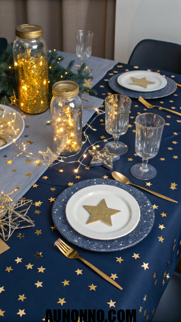 Bring the beauty of the night sky to your table with a celestial theme. Use a deep blue or black tablecloth and incorporate starry elements in your dinnerware. For centerpieces, create a stunning display with twinkling fairy lights in glass jars or star-shaped decorations.