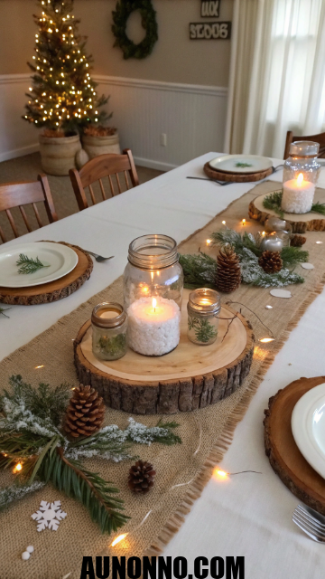 Bring the beauty of winter indoors with a rustic winter wonderland theme. Start with a burlap table runner over a white tablecloth. Use wooden chargers and mismatched vintage plates for a cozy, rustic feel. For centerpieces, create a mini winter scene using pinecones, faux snow, and small evergreen branches in mason jars.