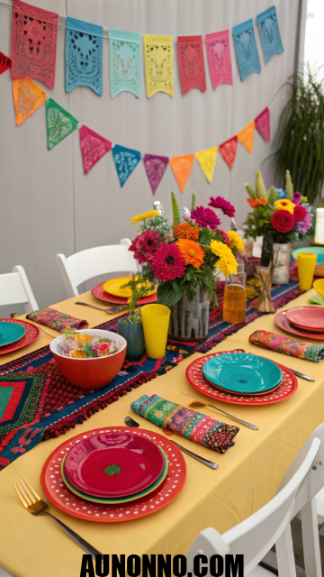 Bring the vibrancy of a fiesta to your New Year’s celebration with a colorful theme. Use a bright, patterned tablecloth and incorporate bold dinnerware in various colors. For centerpieces, create a fun display with colorful papel picado banners and fresh flowers.