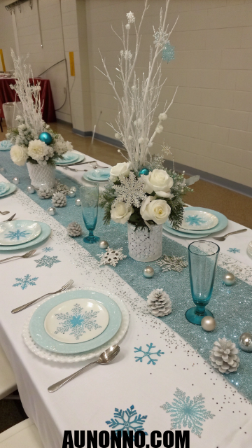 Capture the beauty of winter with a festive winter wonderland theme. Use a white or icy blue tablecloth and incorporate snowflake decorations and winter-themed accents throughout the table setting. For centerpieces, create a stunning display with white flowers, silver branches, and faux snow to evoke a wintery feel.