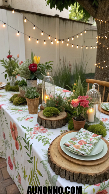 Incorporate natural elements like twinkling fairy lights wrapped around the centerpieces or along the table. Use warm-toned candles in rustic holders to add a soft glow. For place settings, consider using small sprigs of pine or rosemary tied with twine to add a personal touch.