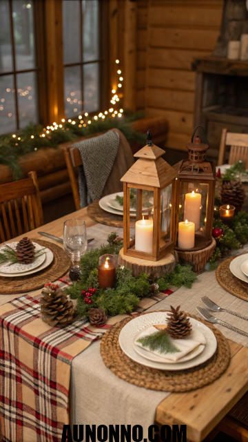 Create a warm and inviting atmosphere with a cozy cabin retreat theme. Use a plaid tablecloth or a rustic wooden table as your base. Incorporate earthy tones in your dinnerware and use wooden chargers for a natural touch.