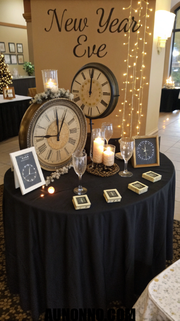 Create excitement for the New Year with a countdown-themed table. Use a black tablecloth as your base and incorporate clocks and countdown elements throughout the decor. For centerpieces, use a large clock or a decorative hourglass surrounded by candles.