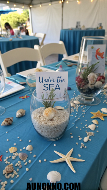 Dive into a whimsical underwater theme with an “Under the Sea” table setting. Use a blue or turquoise tablecloth to mimic the ocean and incorporate seashells and starfish as decorations. For centerpieces, create a stunning display with glass vases filled with sand and seashells.