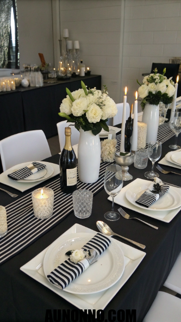 To enhance the elegance, add crystal or glass accents, such as candlesticks or decorative bowls. Incorporate black and white party favors at each place setting, like personalized mini champagne bottles or custom cookies. This theme is perfect for a classy New Year’s Eve dinner.