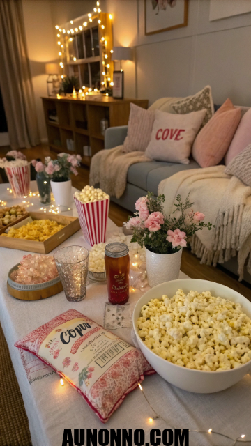 For centerpieces, use vintage popcorn containers filled with flowers or fairy lights. Create a cozy atmosphere with blankets and pillows for guests to lounge on. This theme is perfect for a laid-back gathering with friends and family.