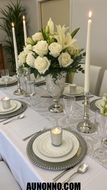 For centerpieces, opt for silver vases filled with white flowers, such as roses or lilies. Incorporate silver candlesticks with white candles to add a touch of warmth. This theme is perfect for a classy New Year’s Eve dinner that exudes elegance and refinement.