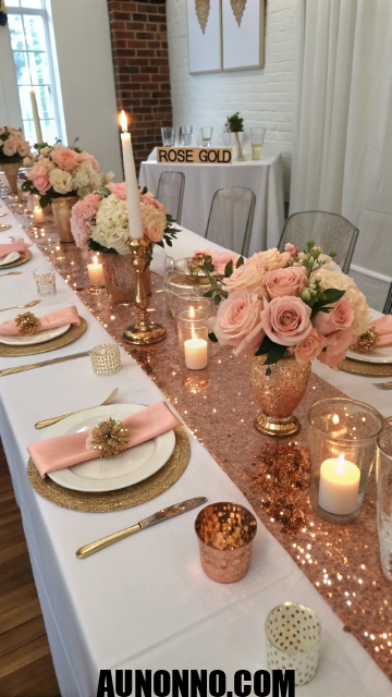For a trendy and chic look, consider a glamorous rose gold theme. Start with a white or blush tablecloth and incorporate rose gold accents in your dinnerware and decorations. For centerpieces, use rose gold vases filled with soft pink flowers or metallic candles.