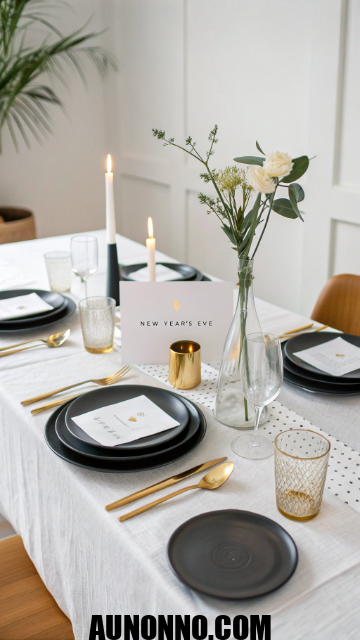Incorporate metallic accents, like gold or silver flatware, to add a touch of sophistication. Use simple place cards with clean lines and a modern font. This theme is perfect for those who appreciate simplicity and elegance in their New Year’s decor.