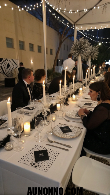 Use soft white roses, monochrome plates, and checkered patterns. Dim lights make shadows fall dramatically across the setup. Candlelight enhances the mood.