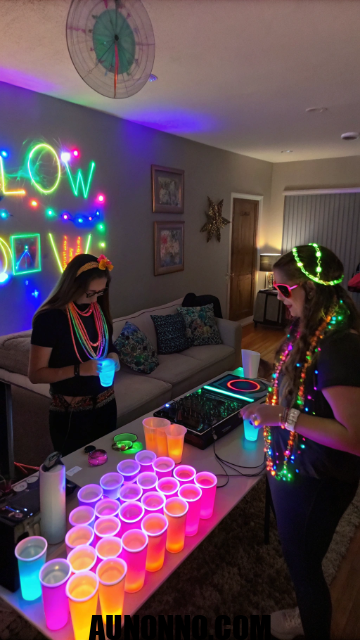 Decorate walls with blacklight tapes and bright designs. Plastic cups with LED ice cubes look fun. Lively music and snacks that glow under UV lights add playful energy.