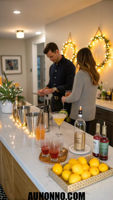Let your living room turn into a mini cocktail bar. Set up a table with ingredients for different drinks and fun labels. Add recipe cards so guests can mix their own favorites.
