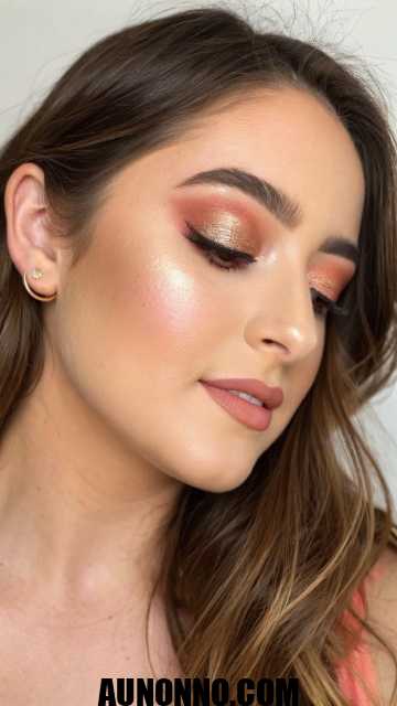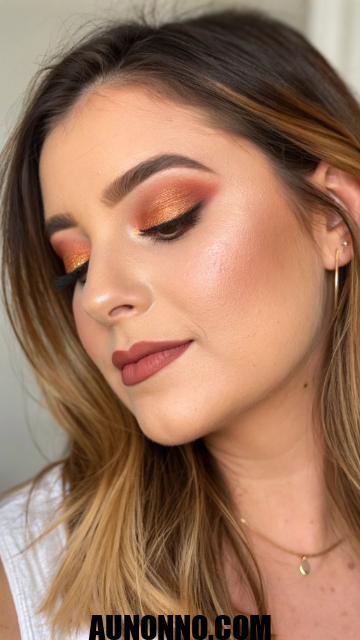 Finish with a warm nude, coral, or peachy lipstick that ties the warm metallic theme together beautifully. Add a bronze or warm-toned blush to your cheekbones to echo the copper and bronze from your eyes throughout your face. Use a bronze or champagne highlighter on your brow bones and cheekbones to catch light and complete this warm, glowing celebration look.
