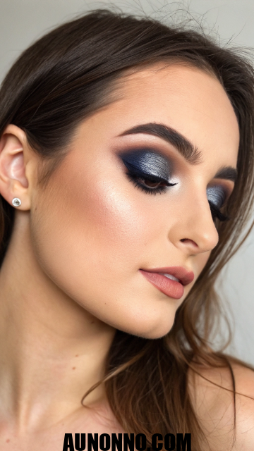 Start with a nude or champagne shade all over your lid to create a base that makes the navy pop. Apply navy blue eyeshadow across your lash line and blend it upward into your crease, creating a soft gradient. Add a touch of silver shimmer to your inner corner and center lid for brightness that prevents the look from appearing too heavy or muddy.