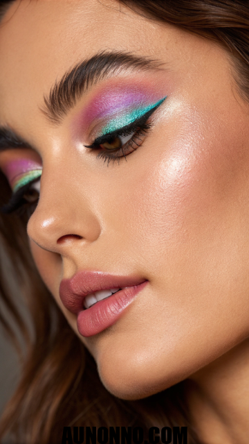 Apply a neutral or metallic base shade across your lids, then layer holographic or duo-chrome eyeshadow on top to create that magical, color-shifting effect. Use a holographic eyeliner to draw a graphic shape or winged line instead of traditional eyeliner styles. The multidimensional nature means the look changes subtly as you move and interact throughout your celebration.
