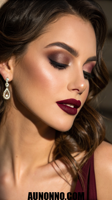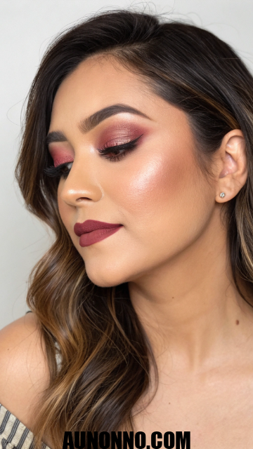 Complete this look with a cream or powder blush in a dusty rose tone to echo the burgundy theme across your face. Keep your highlighter subtle to maintain focus on your lips, which are the star of this makeup moment. This look transitions seamlessly from dinner to dance floor without requiring any touch-ups.