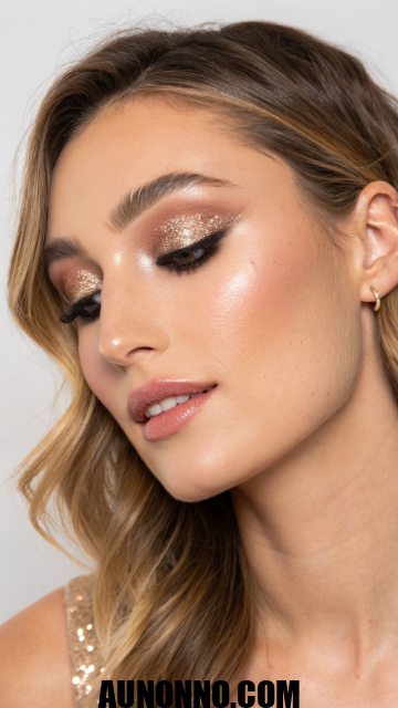 Pair this sparkling eye makeup with a nude, peachy-nude, or soft pink lipstick to balance the shimmer and sparkle concentrated on your eyes. Use a cream or powder highlighter in champagne to your cheekbones, brow bones, and bridge of nose for that lit-from-within glow. This makeup look catches every camera flash and looks incredible both in person and in photographs throughout your entire celebration.